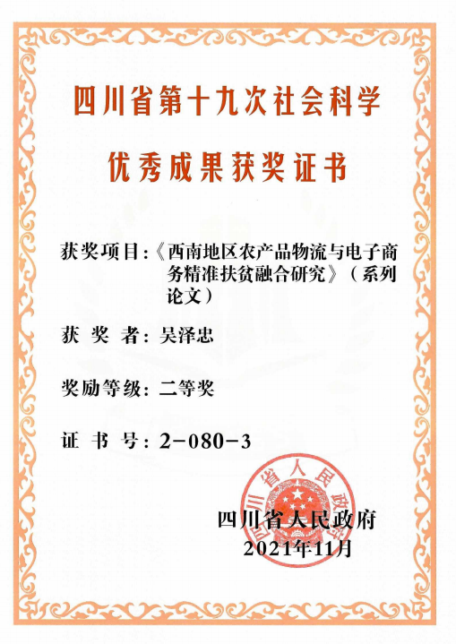 2021年12月27日,四川省第十九次社会科学优秀成果奖颁奖大会在成都举行,表彰近年来我省社会科学优秀成果以及为四川省哲学社会科学发展作出突出贡献的专家学者。其中,我院副院长吴泽忠教授参与的《西南地区农产品物流与电子商务精准扶贫融合研究》系列论文荣获四川省第十九次社会科学优秀成果二等奖。