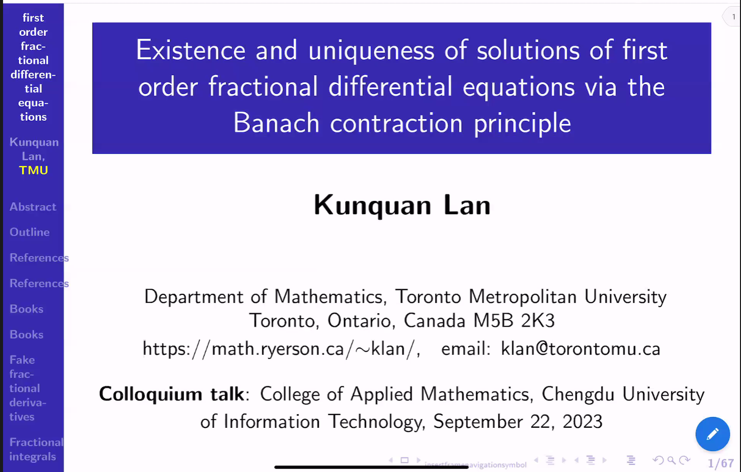 2023年9月22日晚,应bv伟德国际体育官方网站邀请,加拿大多伦多都会大学兰坤泉教授做了题为《Existence and uniqueness of solutions of first order fractional differential equations via the Banach contraction principle》的线上报告。学院院长周钰谦教授主持报告。