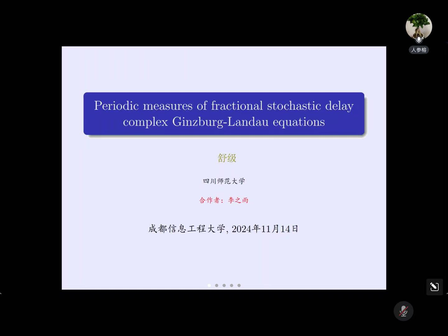11月14日晚上,应bv伟德国际体育官方网站邀请,四川师范大学舒级教授做了题为:“Periodic measures of fractional stochastic delay complex Ginzburg-Landau equations”的线上讲座,讲座由学院院长周钰谦教授主持,部分教师和研究生在线上参加了本次讲座。
