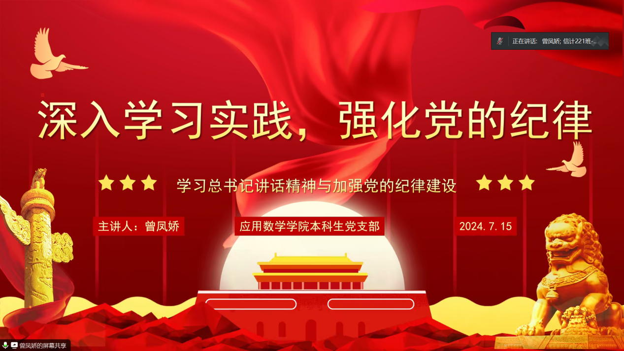 7月15日20:00,bv伟德国际体育官方网站本科生党支部在线上召开了七月专题学习活动。本次学习由支部书记曾凤娇同志主持,全体党员参与,共同学习了习近平总书记在青海、宁夏考察时的重要讲话精神,并深入领会了总书记关于加强党的纪律建设的重要论述。