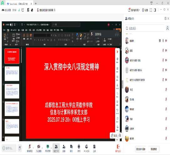 7月20日,党政党支部开展深入贯彻中央八项规定精神学习教育。会议指出,要持续深入学习贯彻习近平总书记关于加强党的作风建设的重要论述和全面从严治党重要讲话精神,跟进学习习近平总书记最新讲话,坚持从抓作风入手,确保学习教育善始善终、取得实效。要对照云南省曲靖市统计造假典型案例,从政治立场、思想认识、纪律作风等方面深刻反思,杜绝形式主义,以严实作风为学院发展提供保障。