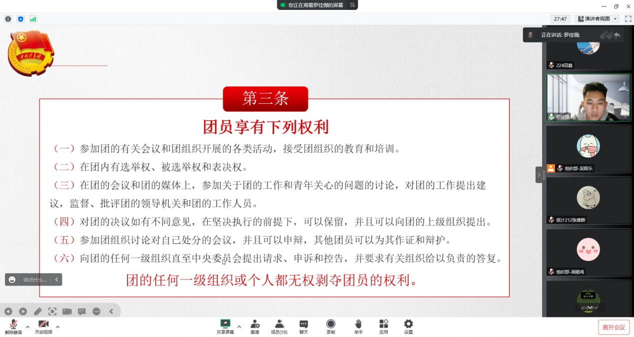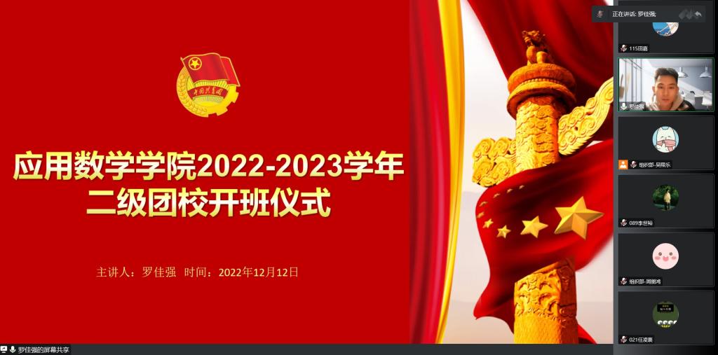 为了充分发挥团组织教育青年的功能,进一步加大对团员青年、团学干部的培养教育力度我院于2022年12月12日19:30在腾讯会议上开展2022-2023学年二级团校开班仪式暨第一堂团课。我院2022级各支部成员、学院组织部全体成员、入团积极分子参加。本次团课由学院团委副书记罗佳强主讲。
